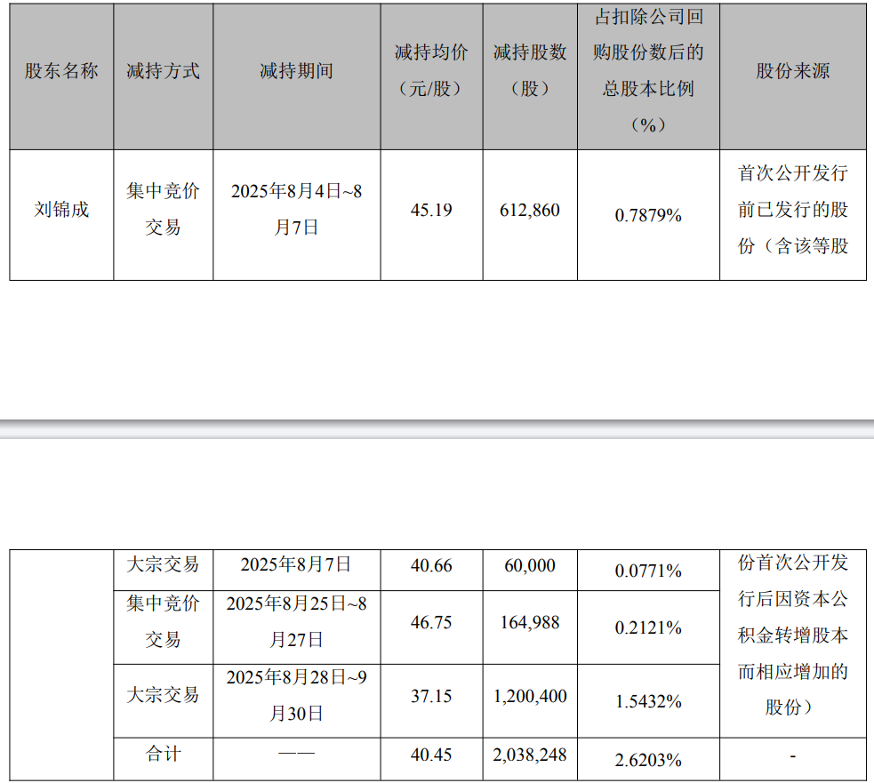 中国经济网北京10月10日电 昨日下午,江南一帆(301023.SZ)披露关于控股股东及实际控制人减持方案完成的公告。 2025年7月11日,公司发布了《关于控股股东及实际控制人减持股份的提前披露公告》。公司第一大股东、实际控制人、总裁刘金成先生持有公司股份32,424,000股(扣除所持股份数量后占总股本的41.6826%),计划自2025年7月11日起开始减持股份。 此前公告披露日期。 15个交易日后3个月内,本次集中发行将减持逾777,879股(即总股本的 1.0000% 减去我们回购的股份数量),并将减少我们持有的股份超过 1,555,758 股(相当于我们总股本的 2.0000%)。扣除公司通过大宗交易回购的股份数量后。若在计划减持期内公司发生除权、派息、送红股、转增股本或转增股本等股利事项,计划减持股份数量将相应调整,但减持股份占公司总股本扣除公司回购股份数量的比例不变。近日,公司收到刘金成先生出具的《减持计划实施完毕通知书》。本次减持计划期间,刘金成共减持公司股份2,038,248股,相当于公司总股本减去股份数量的2.6203%回购了。本次库存削减计划已实施完毕。按照公告披露的每股均价40.45元计算,刘进通过此次降价获得收益约8244.71万元。江南一帆表示,本次减持计划属于正常的减持行为,其实施不会改变公司控制权,不会对公司治理结构、股权结构、未来持续经营产生重大影响,不会导致公司控制权发生变化。江南一帆将于2021年7月7日在深股挂牌,公司在创业板挂牌,公开发行股份933.35万股,发行价格为58.31元/股。保荐机构(主承销商)为中信证券股份有限公司,保荐代表人为徐兴文先生、隋玉耀先生。江南一帆募集资金总额54,423.64万元,募集资金净额486,576700元。江南一帆发行费用为5,765.97万元,其中中信证券股份有限公司收到保荐、承销费用3,773.58万元。据江南一帆2021年6月23日披露的招股书显示,公司拟募集资金36507.9万元,将用于储能减速电机和休闲车减速电机生产基地建设项目及研发中心建设项目。