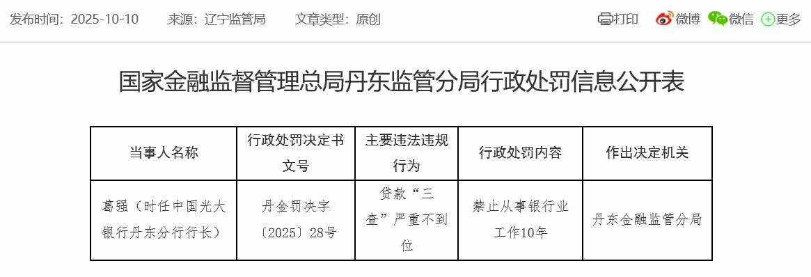 高大银行丹东分行原行长因贷款不进行“三把关”被停职10年。 首页每日更新 在 每日更新 2025年10月11日 0 所有版权归中国经济网所有。 中国经济网新媒体矩阵 网络广播视听节目许可证(0107190)(京ICP040090) 中国经济网北京10月10日电 据丹东市金融监管局行政处罚信息公开表(丹金),主要违规行为是严重未对贷款进行“三检”。原文如下。 (编辑:马贤珍) 中国经济网指出:股市信息由合作媒体和机构提供。这是作者的个人观点。仅供投资者参考,不构成投资建议。投资者采取相应行动,风险自担。 发表回复 取消回复您的邮箱地址不会被公开。 必填项已用 * 标注评论 * 显示名称 * 邮箱 * 网站 在此浏览器中保存我的显示名称、邮箱地址和网站地址,以便下次评论时使用。 作者 相关文章 在 每日更新 工信部:到2027年建成约200个高水平数字园区 2025年11月19日 0 中国经济网版权所有中国经济网新媒体矩阵网络传... 读出全部 在 每日更新 多家A股上市公司进军机器人领域 2025年11月19日 0 中国经济网版权所有中国经济网新媒体矩阵网络传... 读出全部 在 每日更新 健康食品首次被纳入免税品类。 2025年11月18日 0 中国经济网版权所有中国经济网新媒体矩阵网络传... 读出全部 在 每日更新 泡泡玛特致力于为其知识产权注入历史和影响 2025年11月18日 0 中国经济网版权所有中国经济网新媒体矩阵网络传... 读出全部 在 每日更新 奈皮日糖隼为何“破环”? 2025年11月17日 0 中国经济网版权所有中国经济网新媒体矩阵网络传... 读出全部 在 每日更新 300元以内买不到一件真正的羽绒服吗? 2025年11月16日 0 中国经济网版权所有中国经济网新媒体矩阵网络传... 读出全部 文章导航 上篇文章下篇文章
